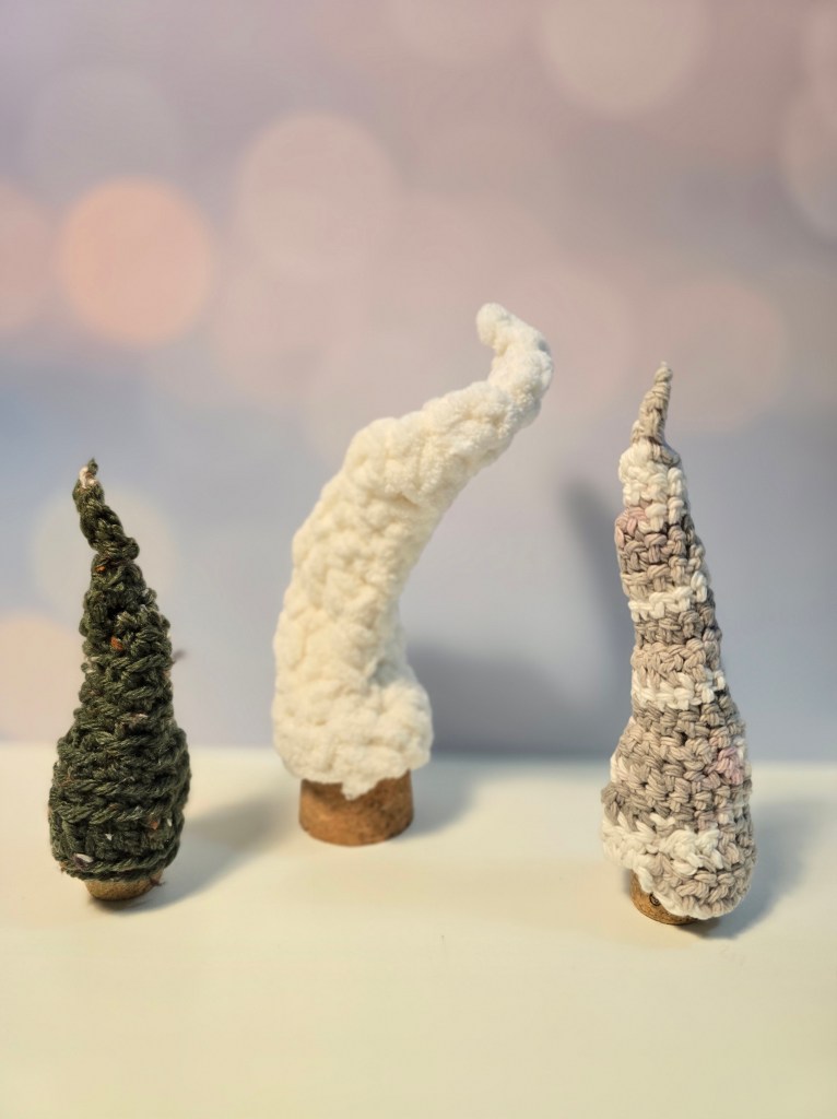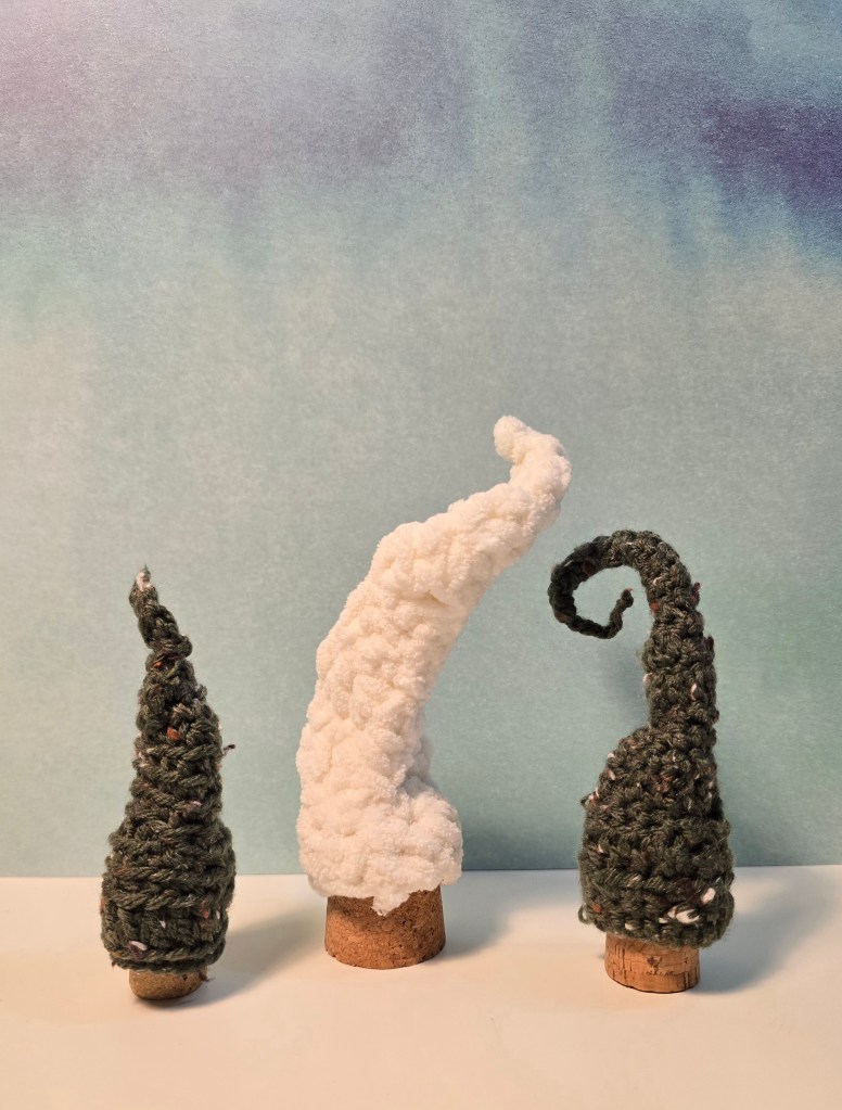 My list of ideas and projects continues to grow, and I’m excited to work on some things! I’ve been playing with yarn this week, making a handful of small crocheted trees. I’m not using a pattern, just experimenting with different stitches and yarn and creating some awkward but cute little cone trees.